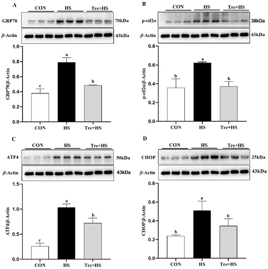 Effects of trehalose on endoplasmic reticulum stress (ERS) response in heat-stressed IPEC-J2 cells. IPEC-J2 cells were cultured at 37 °C until the end of the experiment (control, CON); exposed to heat stress for 2 h (43 °C, HS); or pretreated with 10 mM trehalose at 37 °C for 4 h prior to heat stress exposure for 2 h (Tre + HS). Western blotting analysis of the expression of UPR proteins GRP78 (A), p-eif2α (B), ATF4 (C), and CHOP (D). GRP78: glucose-regulated protein 78; p-eif2α: phosphorylated eukaryotic translation initiation factor 2α; ATF4: transcription factor 4; CHOP: C/EBP homologous protein; Data are shown as mean ± SD (n = 3). Means for variables that do not share a common letter differ significantly (p < 0.05).