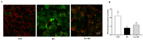 Effects of trehalose on mitochondrial membrane potential in heat-stressed IPEC-J2 cells. IPEC-J2 cells were cultured at 37 °C until the end of the experiment (control, CON); exposed to heat stress for 2 h (43 °C, HS); or pretreated with 10 mM trehalose at 37 °C for 4 h prior to heat stress exposure for 2 h (Tre + HS). Mitochondrial membrane potential was analyzed using JC-1 assay (A,B). Scale bar = 100 µm. Magnification 200×. Data are shown as mean ± SD (n = 3). Means for variables that do not share a common letter differ significantly (p < 0.05).