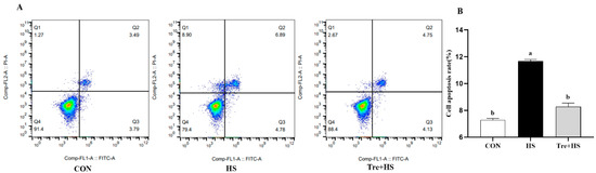 Effects of trehalose on apoptosis in heat-stressed IPEC-J2 cells. IPEC-J2 cells were cultured at 37 °C until the end of the experiment (control, CON); exposed to heat stress for 2 h (43 °C, HS); or pretreated with 10 mM trehalose at 37 °C for 4 h prior to heat stress exposure for 2 h (Tre + HS). Cell apoptosis was measured by annexin V-fluorescein isothiocyanate/propidium iodide staining and flow cytometry assay (A,B). Data are shown as mean ± SD (n = 3). Means for variables that do not share a common letter differ significantly (p < 0.05).