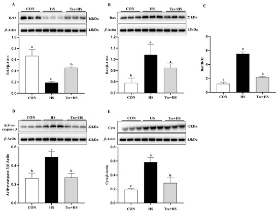 Effects of trehalose on protein expressions of apoptosis-related proteins in heat-stressed IPEC-J2 cells. IPEC-J2 cells were cultured at 37 °C until the end of the experiment (control, CON); exposed to heat stress for 2 h (43 °C, HS); or pretreated with 10 mM trehalose at 37 °C for 4 h prior to heat stress exposure for 2 h (Tre + HS). Western blotting analysis of the expression of Bcl2 (A) Bax (B), Bax/Bcl2 ratio (C), active caspase 3, (D) and Cyt c (E). Bax: BCL2-associated X protein; Bcl2: B-cell CLL/lymphoma 2; active caspase 3: Active cysteine aspartate-specific protease 3; Cyt c: cytochrome c. Data are shown as mean ± SD (n = 3). Means for variables that do not share a common letter differ significantly (p < 0.05).