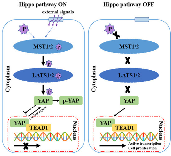 The Hippo signaling pathway plays a role in intracellular signal transduction and is regulated by external signals, such as growth signals. It is generally believed that the normal Hippo pathway exists in two states: on or off. When an external signal is sensed, the pathway is on, and MST1/2 is phosphorylated, causing its activation. MST1/2 in turn activates LATS1/2 via phosphorylation [21], which then phosphorylates the transcriptional coactivator YAP [22]. The phosphorylated form of YAP is retained in the cytoplasm, therefore reducing its activity in the nucleus [23]. When the external stimulation is removed, the pathway is off; YAP enters the nucleus and interacts with the transcription factor TEAD, activating gene transcription [24,25,26]. The inactivated pathway can promote cell and tissue proliferation, playing an important role in organ development (Figure 1).