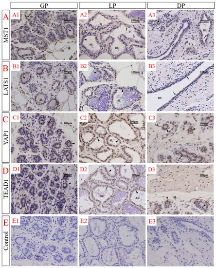 Immunolocalization of MST1, LATS1, YAP1 and TEAD1 in the female yak’s mammary gland tissues at different developmental stages. Immunolocalization of MST1 (A), LATS1 (B), YAP1 (C), and TEAD1 (D) proteins in mammary gland tissues of female yaks during GP (A1–D1), LP (A2–D2), and DP (A3–D3). MST1 (A1), LATS1 (B1), YAP1 (C1), and TEAD1 (D1) appeared in the alveolar clusters (AL) and ductal system (DU) during GP. During lactation, alveolar and ductal epithelial cells were positive. MST1 (A2) and LATS1 (B2) were only positive in the cytoplasm, whereas YAP1 (C2) and TEAD1 (D2) were expressed in the nucleus and cytoplasm. During the dry period, the target proteins (A3,B3,C3,D3) was mainly expressed in the ductal system and scattered in the mammary stroma. Negative control (E): mammary gland tissue sections were incubated with an equivalent non-immune IgG agent instead of a rabbit polyclonal antibody to MST1, LATS1, YAP1, and TEAD1 (E1–E3).