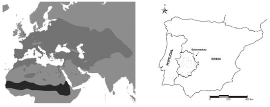 Left: map showing the breeding (dark gray) and wintering (black) distribution of the turtle dove (based on data compiled by Birdlife International, [21]). Right: map of Spain and Portugal showing the region of Extremadura and the locations of the hunting grounds where the study was conducted from 2009 to 2020.