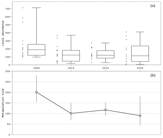 There was a high variability in the estimated local abundance among hunting grounds and years (ranging from 6.2 to 712.8 individuals, Figure 2a), and we observed a population decline when comparing the results of the metapopulation size from 2009 (median: 200.7 individuals per plot) and 2015, 2019 and 2020 (median: 89.9–117.1 individuals per plot) (Figure 2b). A GLM analysis showed that the estimated local abundance was weakly affected by the type (social/private) of hunting grounds (t = 2.00, p = 0.051) and the duration (t = 1.78, p = 0.081) of food provision, while it was not affected by the province (e.g., Cáceres vs. Badajoz, t = 0.29, p = 0.772) and the amount of food provided (t = −0.40, p = 0.691); hence, these were not covariates explaining the estimated local abundance differences among hunting grounds. However, there was strong evidence that commercial hunting grounds were positively associated with higher estimated local abundance compared to noncommercial ones (t = 2.84, p = 0.006).