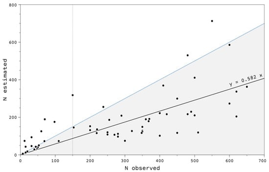 Relationship between the estimated local abundance using the removal sampling protocol (y) and the local abundance observed by hunters/managers (x), in hunting grounds of southern Spain from 2009 to 2020. The solid line shows the non-intercept regression line. The blue dotted line divides the plot between overestimation (gray) and underestimation (blank) areas of the count protocol. The vertical line is the empirical threshold of 150 birds.
