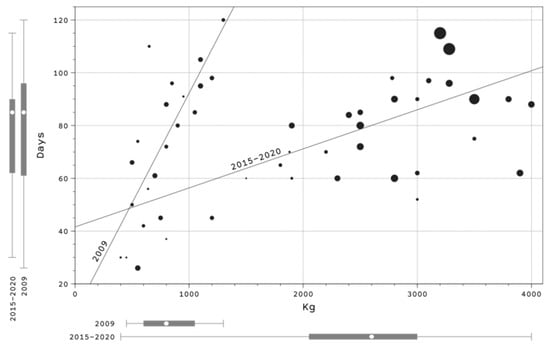 Relationship between the amount of food provided and the duration of food provision in hunting grounds managed for turtle dove from southern Spain, distinguishing two periods: 2009 and 2015–2020. The diameter of the points is proportional to the log-value of the productivity. The solid lines are the regression lines. The small bars in the margins of the plot area show the minimum, Q1, median, Q3 and maximum of each distribution.