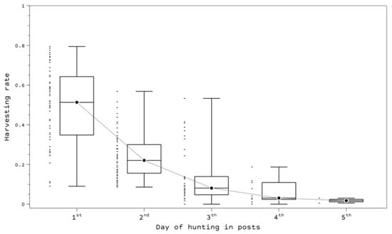 The analysis of the hunting bag in relation to the estimated local abundance showed a high harvesting rate, as half of the hunting grounds (IQi) harvested between 78.4% and 93.2% (median: 84.0%), and 20% of the grounds hunted less than 75% of the estimated local abundance. The harvesting rate was influenced by hunting days in relation to the remaining population size (Figure 5), e.g., during the first hunting day, 51.3% of the estimated local abundance was hunted (IQi: 34.8–64.3%). At commercial hunting grounds, the harvesting rate was 9% higher (median: 90.8%) than that at noncommercial grounds (median: 83.3%).