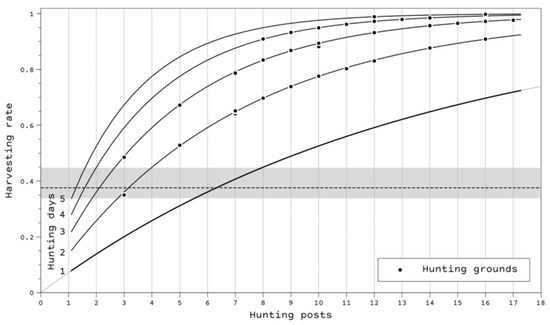 Relationship between the harvesting ratio and the number of hunting days and posts (equivalent to the number of hunters) at hunting grounds in southern Spain. The dashed line shows the maximum harvest rate to ensure sustainable hunting per season (the gray area is the IQ interval), e.g., 1 day of hunting with 6–7 posts (hunters) and 2 days with 2–3 posts.