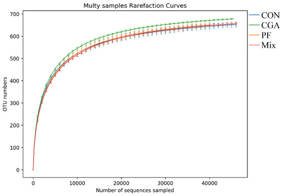 The rarefaction curve was used to verify whether the amount of sequencing data was sufficient to reflect the diversity of species in the samples and to indirectly reflect the abundance of species in the samples [14]. As shown in Figure 1, the rate of emergence of new features (new species) in this experiment tended to level off under continuous sampling, demonstrating that the number of species in this experiment did not increase significantly with the number of sequencings and then the data were analyzed.
