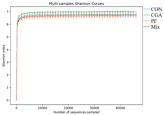 A rarefaction curve of the Shannon index was plotted based on the Shannon index of each sample at different sequencing depths using Mothur software and R language tools. The larger the Shannon index, the greater the number of species and the richer the species, indicating that most of the microbe species were covered in the samples. When the curve tended to be flat, it indicated that the amount of sequencing data was large enough so that the number of feature species did not increase with the amount of sequencing (Figure 2).