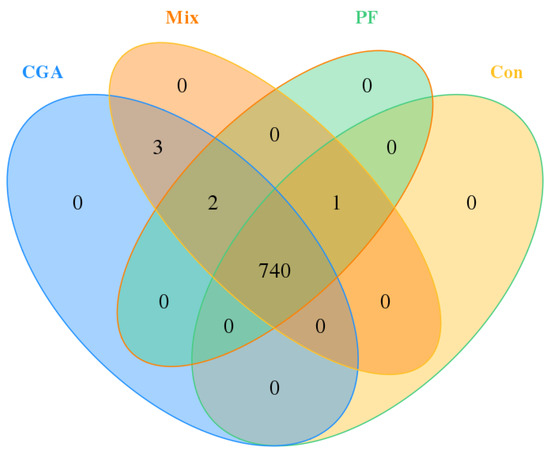 Operational taxonomic units (OTUs), that is, categorical operational units, were clustering OTU consistency at a similarity level of 97.0%. As shown in Figure 3, 746 OTUs were obtained after clustering the samples in each group, with 740 identical OTUs in the control and three experimental groups.