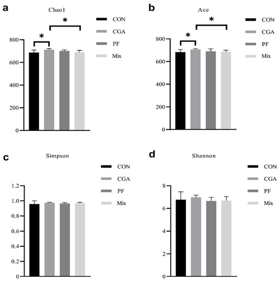Alpha diversity reflects the abundance (richness) and species diversity (diversity) of an individual sample and is measured using multiple indicators: Chao1 index, Ace index, Simpson index, and Shannon index. Among these, Chao1 and Ace indexes can be used to measure species abundance, that is, the number of species. Simpson and Shannon indexes were used to measuring species diversity, with larger Simpson and Shannon indexes indicating higher species diversity in the samples [22]. As shown in Figure 4, Chao1 and Ace indexes were significantly higher in CGA than in the control group and Mix (p < 0.05). In comparison, Chao1 and Ace indexes were higher in PF and Mix than in the control group, although the difference was negligible (p > 0.05). The Simpson index in the three experimental groups was higher than that in the control group, although the difference was negligible (p > 0.05). The species abundance of the fecal microbiome in finishing pigs was higher in all three experimental groups than in the control group, and the fecal microbiome diversity was higher in CGA than that in the control group