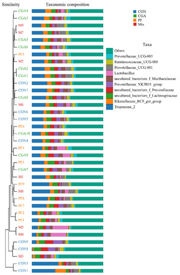 As shown in Table 2 and Table 3, the abundance of Firmicutes in the three experimental groups was significantly higher than that in the control group (p < 0.05). The abundance of the Rikenellaceae-RC9-gut-group in the CGA group was significantly higher than that in the PF group (p < 0.05). The abundance of uncultured-bacterium-f-Prevotellaceae in the control group was significantly higher than that in the PF and control groups (p < 0.05). The abundance of the Prevotellaceae-NK3B31-group in the control group was significantly higher than that in the PF group (p < 0.05). The abundance of Lactobacillus in the Mix group was significantly higher than that in the control group (p < 0.05).