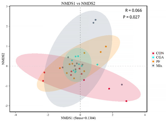 NMDS analysis was performed on the samples, and points of the same color represented one sample from the same group. The closer the distance between the two points, the smaller the difference in community composition between them. As shown in Figure 6, the differences in the fecal microbiome community composition between the three experimental groups were small, but larger compared to that in the control group, indicating that CGA and PF had significant effects on fecal microbiome community composition.