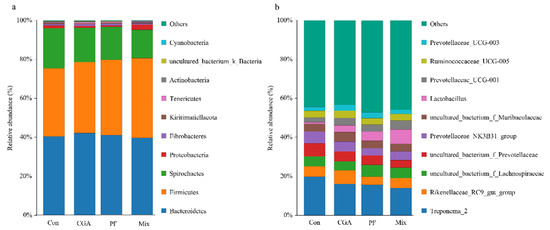 Taxonomic annotation of feature sequences were processed by Bayesian classifier using SILVA as reference database [23]. Statistics on composition in each sample were calculated at the level of phylum, class, order, family, genus, and species. QIIME (Quantitative Insights into Microbial Ecology) was applied to obtain the abundance of each species in samples and distribution histogram at each taxonomic level were generated by certain R package. As shown in Figure 7a,b, the top ten fecal microbiomes in the three experimental groups of finishing pigs in terms of phylum-level abundance were as follows: Bacteroidetes, Firmicutes, Spirochaetes, Proteobacteria, Fibrobaeteres, Kiritimatiellaeota, Tenerieutes, Actinobactena, Uncultured_bacterium_k_Bacteria, and Cyanobacteria. As shown in Table 3, the abundance of Firmicutes in the Mix group was significantly higher than that in the control group (p < 0.05). As shown in Table 4, the top ten fecal microbiomes in finishing pigs in the three experimental groups in terms of genus-level abundance were as follows: Treponema_2, Rikenellaceae_RC9_gut_group, uncultured_bacterium_f_Lachnospiraceae, uncultured_bacterium_f_Prevotellaceae, Prevotellaceae_NK3B31_group, uncultured_bacterium_f_Muribaculaceae, Lactobacillus, Prevotellaceae_UCG−001, Ruminococcaceae_UCG−005, and Prevotellaceae_UCG−003.