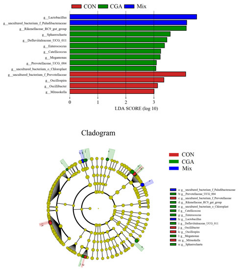 LEfSe (Line Discriminant Analysis (LDA) Effect Size) analysis is a nonparametric test (Kruskal–Wallis rank test) used to detect significant differences in abundance between subgroups in multiple samples, followed by LDA to classify the data and assess the impact of significantly different species (i.e., LDA score) [18]. The roles of microbiota in the three experimental groups were analyzed by counting the specimens with LDA score > 3.0, that is, biomarkers with statistically significant differences. In the cladogram, the species with no significant difference were uniformly colored in yellow, whereas the other species were colored according to the group with the highest abundance. Different colors represented different groups, and nodes with different colors indicated the microbiotas that played an important role in the group represented by the color. Figure 8 shows LDA distribution and LEfSe analysis of the cladogram. As observed, the microbiotas with LDA score > 3.0 in each group were as follows: g_uncultured_bacterium_f_Prevotellaceae, g_Oscillospira, g_Oscillibacter, and g_Mitsuokella. The important microbes in CGA were g_Rikenellaceae_RC9_gut_group, g_Sphaerochaeta, g_Defluviitaleaceae_UCG_011, g_Enterococcus, g_Catellicoccus, g_Megamonas, g_Prevotellaceae_UCG_004, and g_uncultured_bacterium_o_Chloroplast. The important microbes in Mix were g_Lactobacillus and g_uncultured_bacterium_f Paludibacteraceae.