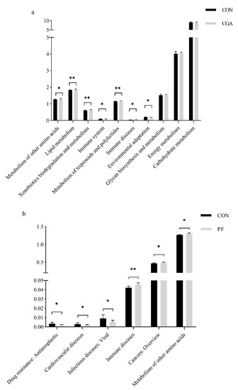 PICRUSt2 was applied to perform species annotation on feature sequences based on reference phylogenetic tree. Potential functions and functional genes in samples were predicted based on Integrated Microbial Genomes (IMG) database, which further revealed the difference in functions between samples or groups [24]. As shown in Figure 9, lipid metabolism, metabolism of other amino acids, xenobiotics biodegradation and metabolism, and metabolism of terpenoids and polyketides in CGA were extremely significantly higher than those in the control group (p < 0.01). Moreover, the immune disease probability was significantly higher (p < 0.05). At the same time, the glycan biosynthesis and metabolism, energy metabolism, and carbohydrate metabolism were higher in CGA than in the control group, although the difference was negligible (p > 0.05). The immune system and environmental adaptation in CGA were significantly lower than those in the control group (p < 0.05). The probability of immune diseases (p < 0.01), metabolism of other amino acids, and cancers: overview (p < 0.05) were significantly higher in PF than in the control group. The probability of cardiovascular diseases, drug resistance: antineoplastic, and infectious diseases: viral was significantly lower in PF than in the control group (p < 0.05). However, the metabolism of other amino acids (p < 0.01), immune diseases, xenobiotics biodegradation and metabolism, carbohydrate metabolism, lipid metabolism, and cancers: overview (p < 0.05) were significantly higher in Mix than in the control group. However, the substance dependence, immune system, environmental adaptation, biosynthesis of other secondary metabolites, and transport and catabolism were significantly lower in Mix than in the control group (p < 0.05).