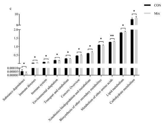 Composition and differential analysis of KEGG metabolic pathways. (a) Composition and differential analysis of the CON-CGA KEGG metabolic pathway. (b) Composition and differential analysis of the CON-PF KEGG metabolic pathway. (c) Composition and differential analysis of the CON-Mix KEGG metabolic pathway. All bar charts show means ± SD, * = p < 0.05; ** = p < 0.01.
