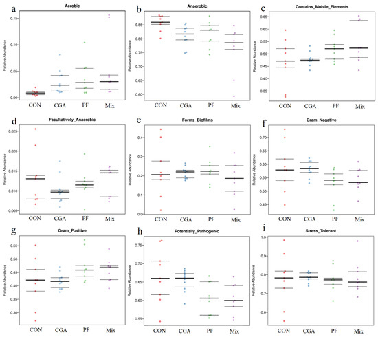BugBase is a novel method for analyzing complex microbiome data, which provides biologically relevant microbiome phenotype predictions at the organism level. First, BugBase normalizes OTU by predicted 16S copy number. Microbial phenotype is predicted based on given pre-calculated files [21]. Lonicera japonica and Radix Puerariae crude extracts improved the prediction of the fecal microbiome BugBase phenotype, with Mix aerobic, containing mobile elements significantly higher than the CON group (Figure 10a,c); anaerobic was significantly lower than the CON and PF (Figure 10b), and fecal microbiome potential pathogenicity significantly lower than CON group in Mix and PF (Figure 10h).