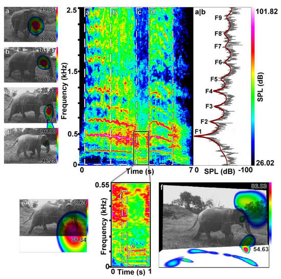 Example of a roar–rumble combination. Emitted during the separation phase of a separation–reunion experiment by Hira (f, 45y). This shows acoustic camera images of different time and frequency ranges (a–f) and the corresponding spectrogram, with a zoom–in on the rumble part (e,f) and the power spectrum (a,b) taken in the middle of the roar between selection window a and b. The LPC function line in red indicates the formant positions (F1–F9); (a,b,d) show the oral only emission of the roar parts; (c) shows the partial oral emission of the mixed emission rumble part, exhibiting a distorted sphere and the (e) nasal emission of the lower harmonics; (f) shows a pattern of simultaneous sound radiation over the front, the mouth and trunk, as well as a strong ground reflection here at the transition between roar and rumble.