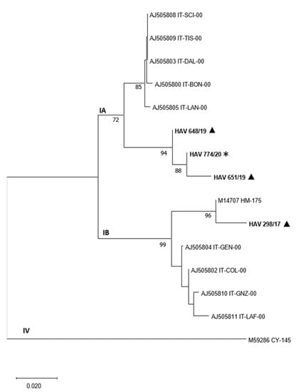 - Chironna, M.; Grottola, A.; Lanave, C.; Villa, E.; Barbuti, S.; Quarto, M. Genetic Analysis of HAV Strains Recovered from Patients with Acute Hepatitis from Southern Italy. J. Med. Virol. 2003, 70, 343–349. [Google Scholar] [CrossRef]