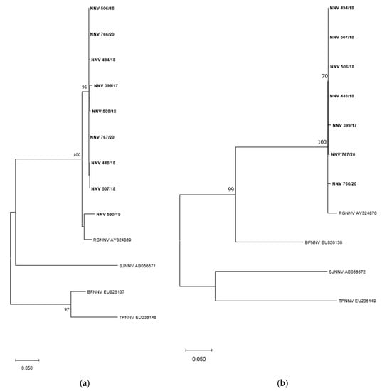 Maximum likelihood phylogenetic tree based on the partial RNA1 (a) and RNA2 (b) nucleotide sequences of NNV. Sequences obtained in this study are in bold. Sequences retrieved from GenBank are reported with the genotype name and the accession number. Bootstrap values >70% are shown. Branch lengths are scaled according to the number of nucleotide substitutions per site. The scale bar is reported.