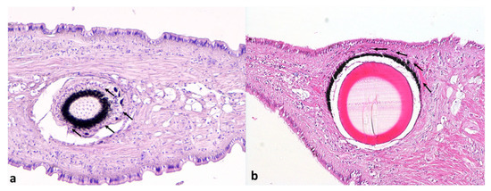 Furthermore, no histological changes affecting the photoreceptors and the basal retinal neurons of the eyes were detected (Figure 4a,b).