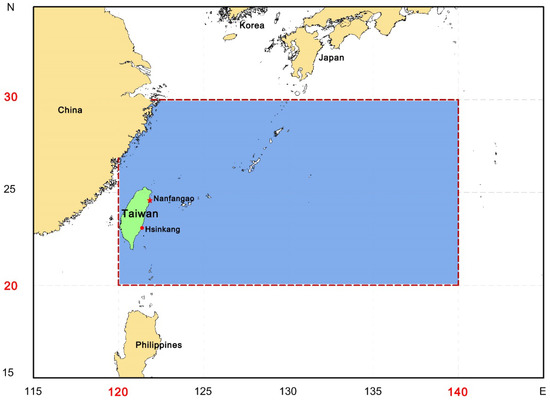 The study area (from 20° N to 30° N, 120° E to 140° E) in the present study. Red star is Nanfangao fishing port, red circle is Hsinkang fishing port.