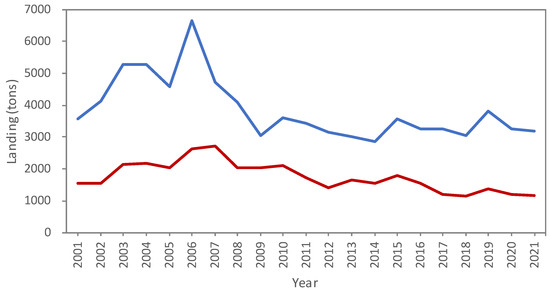 Annual landing at Nanfangao (blue line) and Hsinkang (red line) fishing ports from 2001 to 2021.