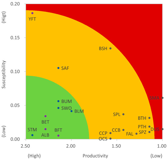 The shortfin mako and dusky shark had the lowest productivity index value (p = 1.00) which corresponded to the lowest productivity, followed by the bigeye, pelagic thresher and smooth hammerhead (p = 1.14), and the striped marlin and yellowfin tuna had the highest productivity index value of 2.43 (highest productivity) (Table 3). The yellowfin tuna had the highest susceptibility value (S = 0.1864), followed by the blue shark (S = 0.1344), sailfish (S = 0.1053), shortfin mako shark (S = 0.0613), and blue marlin (S = 0.0563). The oceanic whitetip shark had the lowest susceptibility value of 0.0009 due to its smallest catchability (0.0013) (Table 4).