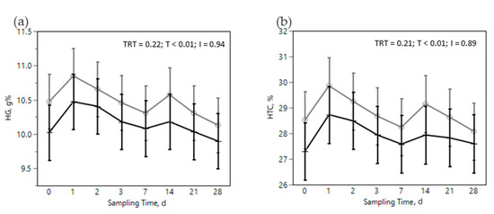 In addition, the challenge diet was associated with a decrease in red blood cell (RBC) parameters, mostly HG, HTC, ERT, MCV, MCHC, and RWI (Figure 2), highlighting the stress experienced by the animals. During chronic stress mature red blood cell forms decrease and more immature forms (RET) are released [69]. RET usually have higher volume and lower content in HG, which are likely the reasons for the decrease observed in MCHC and the increase in RWI in this trial. Altogether, the changes observed in rumination parameters and production, and in metabolic and immune markers suggest that the diet fed during the SARA challenge was effective in creating the intended nutritional, metabolic and immunological stress.