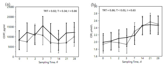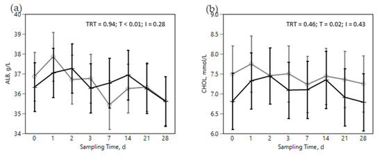 Some immune and metabolic markers increased over the dietary challenge: EOS, CER, SAA, ILs, GGT, PON, and ROM. Acute phase proteins are produced mainly in the liver and are considered sensitive markers of inflammation. The positive APP, including CER and SAA, have a protective role against pathogens, e.g., in neutralizing enzymes, scavenging free hemoglobin and radicals, and in modulating the host’s immune response [62]. The increase in CER (Figure 4b), even if not specific, is an expression of a systemic and innate reaction of the organism to inflammation triggered by external (pathogens, toxins, etc.) or internal (tissue damage, etc.) stimuli [63]. Moreover, SAA (Figure 4c) is reported as a marker of the ruminal LPS translocation in cattle [17,20]. This increase could be related in our study to the dietary challenge, probably because of a translocation of LPS out of the digestive tract into the portal circulation [17,63]. The increase in positive APP was also seen in previous nutritional challenge trials [64,65], in which an increase in plasma concentrations of positive APP were observed when rumen pH was below 5.8 for at least 6 h a day. On the contrary, ALB, a negative APP, slightly decreased over the dietary challenge (Figure 5a) which is likely the consequence of a shift towards production of positive APP in the liver [66,67]. CHOL, another marker of cow wellbeing, diminished in the challenge phase of our study (Figure 5b) and this supports the impact of the dietary challenge on immune function and metabolism. Previous studies [68] reported a lower level of plasma CHOL in farms with high prevalence of SARA; CHOL was used in that study as an index of the CHOL binding protein, a negative APP related to an inflammatory response.