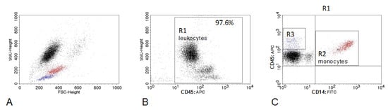 Representative dot plots depicting the gating strategy of canine peripheral blood leukocytes. (A) Forward scatter (FSC-hight) vs. side scatter (SSC-hight) dot plot showing leukocyte populations (population colors result from the regions set on the cytogram C); (B) debris and non-cellular elements were eliminated by setting a region defining CD45+ leukocytes (R1) on the SSC vs. CD45:APC dot plot; (C) leukocyte populations “(R1)” were analyzed on the CD45:APC/CD14:FITC dot plot in order to separate CD14+ monocytes (R2—red color) from lymphocytes (R3—blue color).
