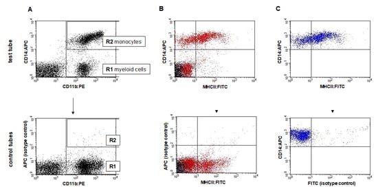 Representative dot plots depicting gating strategy of peripheral blood monocytes of dog with lymphoma. (A) Regions were set for all CD11b+ myeloid cells (R1) and for CD14+ monocytes (R2) on the CD14:APC vs. CD11b:PE double fluorescence dot plot; (B) distribution of all leukocytes (CD11b+ cells—red color) and (C) monocytes (from the R2 region—blue color) according to the expression of CD14 and MHCII. Bottom-row dot plots show isotype controls, separate for each Ab: anti-CD14 (A,B) and anti-MHCII (C). Controls allowed us to set the quadrants.