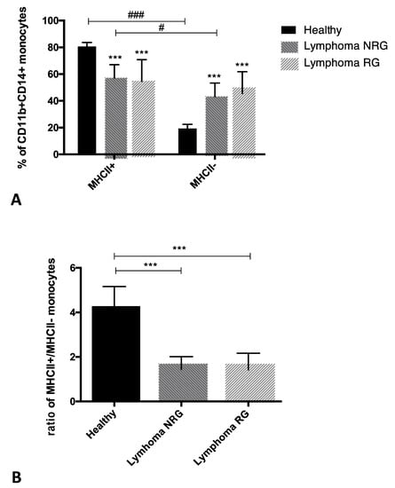 (A) The percentage of CD11b+CD14+ monocytes: MHCII+ and MHCII−, in the peripheral blood of healthy dogs (n = 11) and dogs with lymphoma: not receiving any drugs (NRG, n = 10) and receiving glucocorticoids (RG, n = 8). Arithmetic mean ± standard deviation. Significant differences between the percentage of MHCII+ and MHCII− monocytes among each group: # p < 0.05, ### p ≤ 0.001 (Wilcoxon) and for the percentage of MHCII+ or MHCII− monocytes in comparison to healthy dogs: *** p ≤ 0.001 (no significant differences between dogs with lymphoma NRG and RG) (Kruskal–Wallis and post hoc Dunn analysis). (B) The results are shown as the ratio of CD11b+CD14+ monocyte percentages: MHCII+ to MHCII−. Arithmetic mean ± standard deviation. Significant differences between groups: *** p ≤ 0.001 (Kruskal–Wallis and post hoc Dunn analysis).