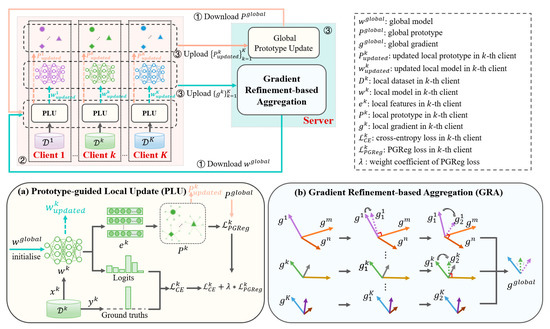 where λ is the weight coefficient of PGReg loss and its value equals 0 in the initial state. Then, we conducted the local training (see Equation (1)) to obtain the updated local model . The updated local prototype can be computed based on the feature vectors of correctly classified samples using the updated local model . The local gradient can be calculated as the difference between the updated local model and the initial local model (i.e., the downloaded global model ). Afterwards, all local gradients and local prototypes are uploaded to the server to update the original global model and global prototype.