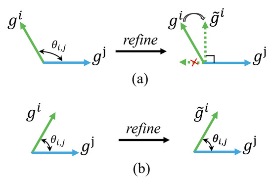 Given a set of local gradients that are uploaded to the global server, we first characterised any two of these gradients as conflicting when their directions point away from one another (i.e., having a negative cosine similarity). Herein, we aimed to reconstruct consensus vectors by refining the conflicting local gradients and keeping the non-conflicting local gradients invariant. Figure 2 visualises the main step of the local gradient refinement process. Specifically, suppose gi is the local gradient at the i-th client and gj is selected in a random order from the rest of the local gradients, where and . The cosine similarity between gi and gj can be denoted as , where is the angle between gi and gj. As shown in Figure 2a, if gi conflicts with gj (i.e., cosine similarity < 0), we remove the component of gi in the direction fully opposite that of and alter by its projection onto the normal plane of gj: