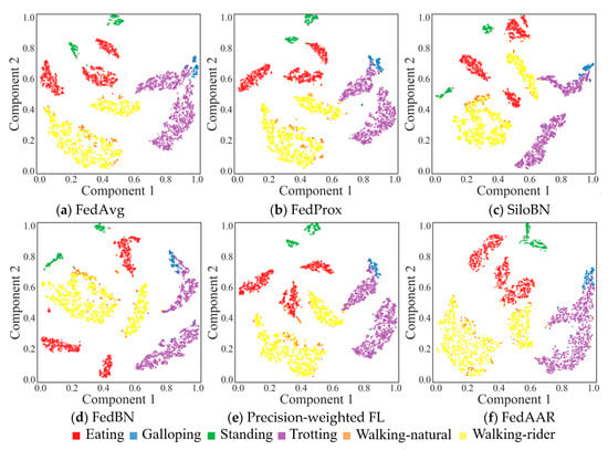 During training, we used softmax cross-entropy loss with L2 regularisation (a weight decay of 0.15). An Adam optimiser with an initial learning rate of 5 × 10−5 was used, and the learning rate decreased by 0.1 times every 20 epochs. The communication rounds T and batch size were set to 100 and 256, respectively. If not specified, the value of local training epochs E was set to 1, and the weighting coefficient λ in PLU was set to 0.05 by default. The global model was initialised randomly before being downloaded to clients in the first round. Over the communication rounds, the best global model with the highest testing accuracy was saved as the optimal model. To verify the model’s generalisation abilities, we performed the leave-one-out-based validation method. Specifically, we separately ran three times in each experiment. In each run (time), we randomly selected five horses from the original six horses and individually assigned these five horses to five farms (clients). Each of these five horses’ data serves as each client’s data, and all client data were used as training data to train a shared global model collectively. The data from the remaining horse (the sixth horse) were then used as the test data to verify the performance of the trained global model. The final test result of the model performance is presented in the format mean ± std from the three runs. This kind of data allocation can well simulate practical scenarios, i.e., data heterogeneity across farms, since the movement patterns of individual animals are often drawn from distinct distributions. All experiments were executed using the PyTorch framework on an NVIDIA Tesla V100 GPU. The source code is available at https://github.com/Max-1234-hub/FedAAR (accessed on 20 June 2022).