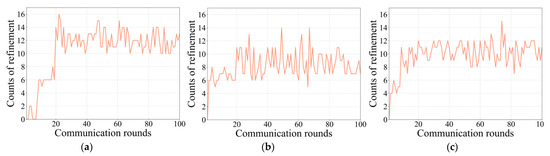 Visualisation of refinements in GRA: To provide further insights into the enormous contributions of the GRA module, we visualise the counts of gradient refinement operations during the training process over three runs in Figure 4. It can be observed that various numbers of gradient modulation operations occur in each communication round, which confirms that conflicts among local gradients arise continuously during the training process. In addition, this observation implies that our framework can constantly and steadily recalibrate the local gradients across clients, effectively enhancing the model’s performance. This finding also reinforces the suitability of the proposed GRA module for AAR tasks in the context of data heterogeneity.