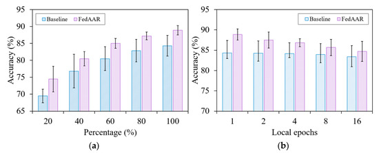 To observe the behaviour of our proposed method over different data capacities, we present in Figure 5a the average testing accuracy of FedAAR and the baseline under various local dataset percentages (i.e., 20%, 40%, 60%, 80%, and 100%). The test accuracies of both FedAAR and the baseline decrease gradually as the number of training samples reduces, but the accuracy of FedAAR continues to exceed that of the baseline, validating the performance advantages of our method under scenarios with a small amount of data. In addition, FedAAR conducted on 60% local data still obtains higher accuracy than the baseline performed on full-sized local data, which reveals that our approach can effectively mitigate the performance degradation due to the reduced data amount.