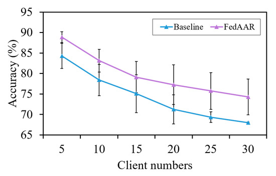 Testing accuracy of FedAAR and its baseline over various client numbers.