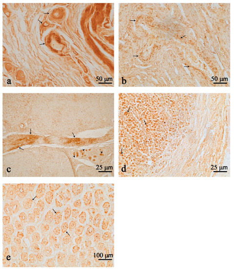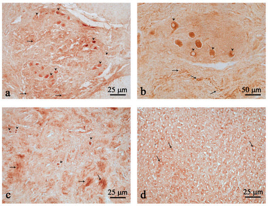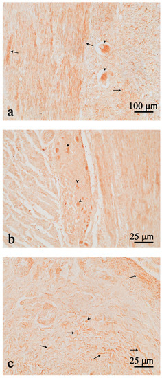 Immunopositive neurons either isolated (Figure 3a) or clustered in ganglia structures (Figure 3b) were scattered throughout the intestine. Many fibers were observed in the intestinal tract (Figure 3a–c). No positive cells were detected in the mucosal epithelium of the gut.