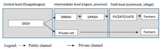 - Public channel: Here, the central government, through its regional agencies, is responsible for the distribution of the vaccines, as well as the vaccination of animals in areas where their staff is available. Most of times in such areas, there are no established private veterinarians. Vaccines are distributed successively from central veterinary services called General Directorate of Veterinary Services (Direction Générale des Services Vétérinaires -DGSV) to 13 regional services called Regional Directorate of Animal and Fisheries Resources (Direction Régionale des Resources Animales et Halieutiques -DRRAH), 45 provincial services called Provincial Directorate of Animal and Fisheries Resources (Direction Provinciale des Resources Animales et Halieutiques -DPRAH), and 351 communal services representing the vaccinators including the staff of the Veterinary Posts (Poste vétérinaire -PV), Livestock Technical Support Area (Zone d’Appui Technique en Elevage -ZATE), and Livestock Technical Support Unit (Unité d’Appui Technique en Elevage -UATE).