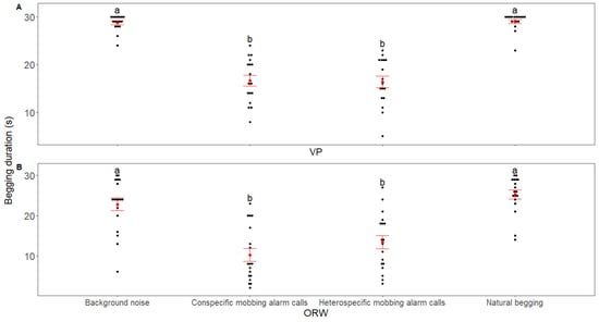 Comparison of the begging duration from nests as a response toward playback stimuli between (A) VP and (B) ORW in the playback experiment. The red points and whiskers represent the mean and standard errors of the observed data, respectively. The black points represent the raw data, while treatments with the same/different letters indicate the nonsignificant (p ≥ 0.05)/significant (p < 0.05) differences in responses, respectively.