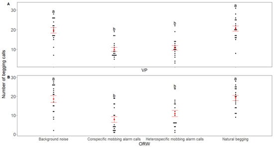 Comparison of the number of begging calls from nests as a response to playback stimuli between (A) VP and (B) ORW in the playback experiment. The red points and whiskers represent the mean and standard errors of the observed data, respectively. The black points represent the raw data, while treatments with the same/different letters indicate the nonsignificant (p ≥ 0.05)/significant (p < 0.05) differences in responses, respectively.
