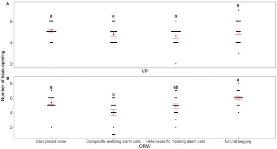 Comparison of the number of beak-openings from nests as a response toward playback stimuli between (A) VP and (B) ORW in the playback experiment. The red points and whiskers represent the mean and standard errors of the observed data, respectively. The black points represent the raw data, while treatments with the same/different letters indicate the nonsignificant (p ≥ 0.05)/significant (p < 0.05) differences in responses, respectively.