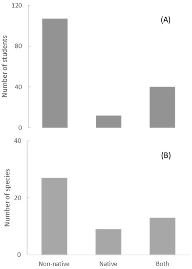 (A) Frequencies of responses and (B) number of different taxa, when the preferred species was a non-native taxon, a native taxon, or a taxon that could be regarded as both native and non-native species.