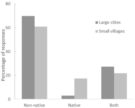 Percentages of responses for which the preferred species were native, non-native, or taxa that included both categories, comparing respondents who had always lived in large cities with those who had once lived or lived in small villages. Those who once lived in the countryside showed a significantly greater preference for native species.
