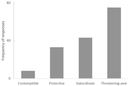 There was a pattern of most preferred animals linked to the type of stereotype associated with the animal species. The most preferred species belonged to the threatening–awe stereotype and the least preferred animals were those belonging to the contemptible stereotype (χ2 (3) = 58.0, p < 0.00001) (see Figure 4). The species associated with the other two stereotypes showed intermediate preference.