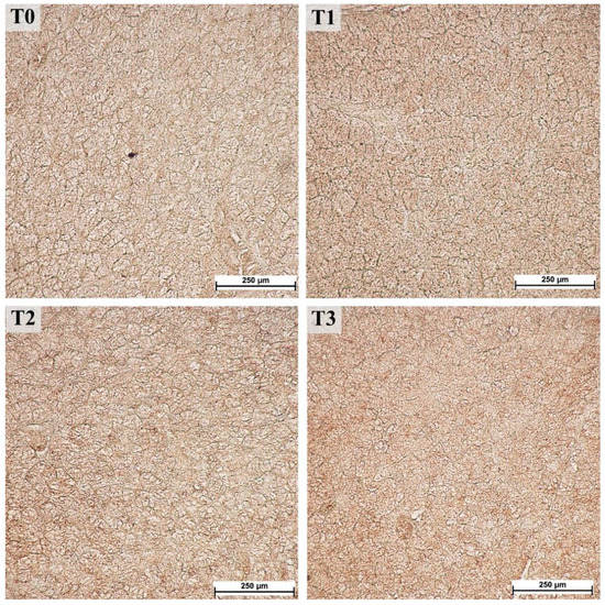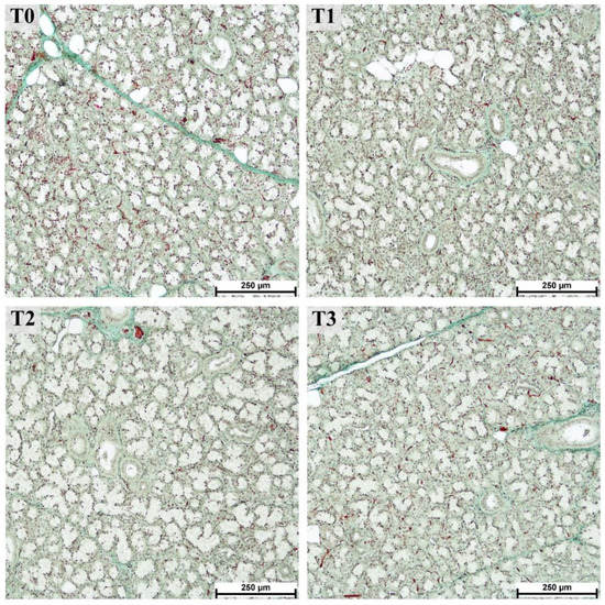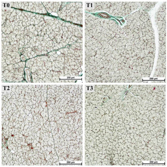 Compared to the parotid gland, the effect of tannin supplementation on the measurements of histological structures in the mandibular gland was less pronounced (Table 2). Nevertheless, the measurements of the lobule areas showed a 1.6-fold increase in T2 (p > 0.0001) compared to T0. Surprisingly, it was only 1.2-fold higher in the group with the highest tannin supplementation (T3; no statistically significant difference, p > 0.1). A tendency toward a decreased area of mucous acini (p = 0.0794) and excretory ducts (p = 0.1154) was observed with increased tannin supplementation (shown by a significant linear trend, p < 0.04).